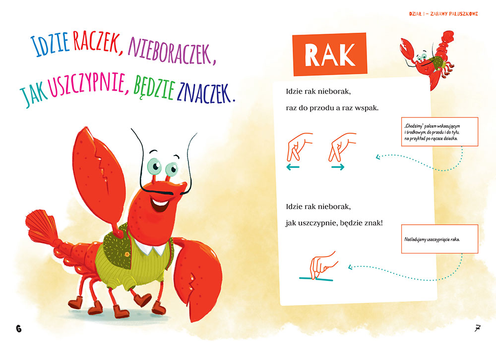 Zabawy paluszkowe zawierają takie rymowanki jak Idzie rak nieborak..., Sroczka kaszkę warzyła, Idzie kominiarz po drabinie... czy Tańcowały dwa Michały. To bardzo znane utwory będące częścią polskiej kultury, bez których trudno wyobrazić sobie dzieciństwo. Każdej rymowance towarzyszą nie tylko kolorowe ilustracje, ale również czytelne schematy dłoni wraz z komentarzami, które dokładnie wyjaśnią, ja należy się bawić, by wykorzystać w stu procentach potencjał rymowanki. Są to oczywiście jedynie sugestie dla czytającego - możliwości zabawy są nieskończone!