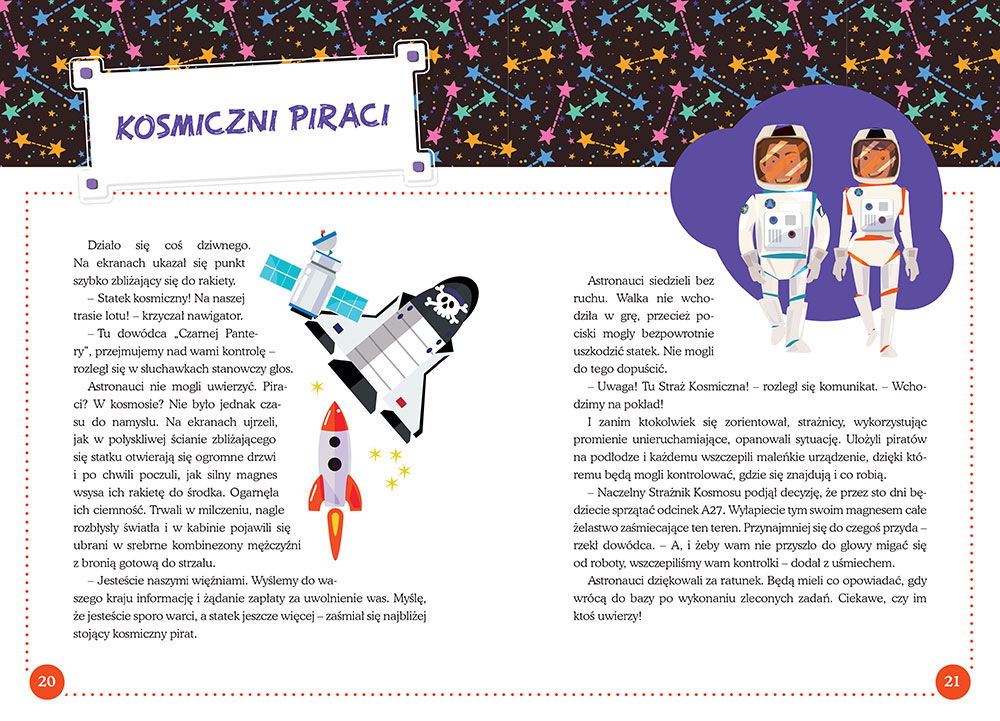 Przedstawiamy ksi±¿eczkê, która z pewno¶ci± spodoba siê ka¿demu ch³opcu! Znajduj± siê w niej krótkie, ciekawe opowie¶ci, pe³ne motywów i tematów uwielbianych przez ma³ych czytelników - fascynuj±ce historie o przygodach piratów i astronautów, o ol¶niewaj±cych bitwach i walkach, o wspania³ych zwyciêstwach dobra nad z³em. S± tu wiêc odwa¿ni piraci, ¶miali astronauci, dzielni rycerze, ¼li czarownicy, magowie, kosmici, a tak¿e zwyczajni ch³opcy. Najwa¿niejsze jednak, ¿e wszystko zawsze dobrze siê koñczy! Maluchy nie bêd± mog³y rozstaæ siê z t± ksi±¿k±!