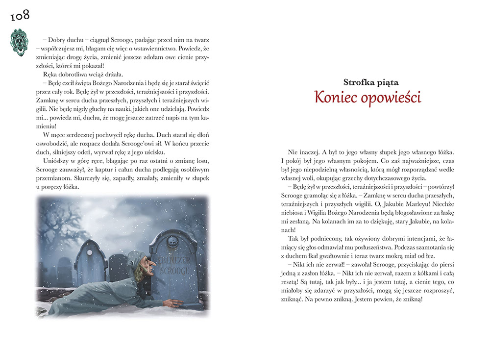 Podróż Scrooge podróż przez własne życie, może być taką podróżą również dla nas. Na podstawie tego co mówią i jakie obrazy ukazjują bohaterowi duchy i przed naszymi oczami mogą stanąć poszczególne kadry z naszego życia. Możemy przeanalizować je, prześledzić, zobaczyć co nas kształtowało, zmieniało i w jaki sposób. Zastanowić się nad tym co tak naprawdę liczy się w życiu, co daje prawdziwą radość, szczęście, czym one są i jak je osiągnąć a także analizy własnego życia. Czy warto? Odpowiedź jest jedna TAK WARTO (...) Jeśli chodzi o przekład „Opowieści wigilijnej” słyszałam, że najlepszy jest Krystyny Tarnowskiej. Może nie należy do najlżejszych, jednak rzeczywiście posiada i tworzy klimat.. aurę minionych czasów, tajemnicy, atmosferę, którą czuć podczas wizyty każdego z duchów a zimą również Świąt.