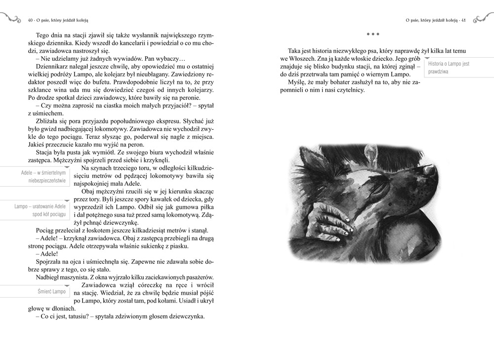 O psie który jeździł koleją to piękna opowieść o przyjaźni pomiędzy człowiekiem a psem o oddaniu i całkowitym poświęceniu. Historia, która od lat jest uwielbiana przez kolejne pokolenia dzieci. Nam historia Lampo bardzo się spodobała, mimo, iż jej finał był dla niego tragiczny, to dokonał wielkiej rzeczy i wykazał się niesamowitą odwaga i oddaniem. Polecamy wszystkim opowieść o niesamowitym bohaterze.
