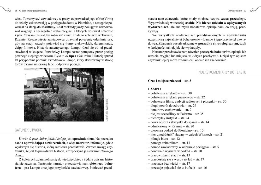 Wydanie książki O psie, który jeździł koleją kompletne bez skrótów i cięć w treści. W tym wydaniu znajdziesz odpowiedzi na pytania z podręcznika - „pewniak na teście”, czyli wskazanie zagadnień, które zwykle pojawiają się w pytaniach z danej lektury we wszelkich testach sprawdzających wiedzę, a także w podręcznikach i na klasówkach. Książka zawiera pełen tekst lektury. Na końcu książki zamieszczono opracowanie, w którym znajduje się bardzo szczegółowe streszczenie oraz drugie skrócone, ułatwiające szybkie przygotowanie się przed lekcją. Opracowanie zawiera ponadto plan wydarzeń, wnikliwie wyjaśnioną problematykę oraz szerokie charakterystyki bohaterów.