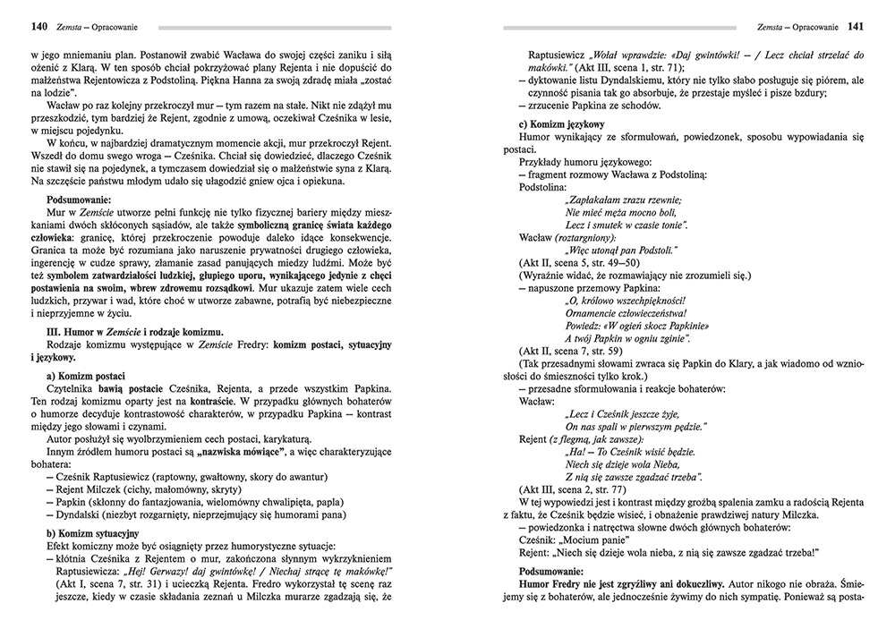 Wydanie Zemsty kompletne bez skrótów i cięć w treści. W tym wydaniu znajdziesz odpowiedzi na pytania z podręcznika - „pewniak na teście”, czyli wskazanie zagadnień, które zwykle pojawiają się w pytaniach z danej lektury we wszelkich testach sprawdzających wiedzę, a także w podręcznikach i na klasówkach. Książka zawiera pełen tekst lektury. Na końcu książki zamieszczono opracowanie, w którym znajduje się bardzo szczegółowe streszczenie oraz drugie skrócone, ułatwiające szybkie przygotowanie się przed lekcją. Opracowanie zawiera ponadto plan wydarzeń, wnikliwie wyjaśnioną problematykę oraz szerokie charakterystyki bohaterów.